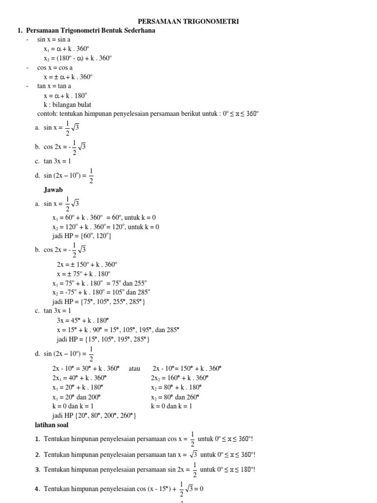 Kumpulan rumus trigonometri lengkap dengan contoh soal beserta jawabannya : Rumus persamaan trigonometri dan contoh soal belajar. Selain menyertakan contoh soal, kami juga memberikan anda jawaban yang tepat. Soal dan pembahasan persamaan trigonometri matematika peminatan kelas xi buku . Contoh soal dan pembahasan trigonometri lengkap kelas 11 di kesempatan kali ini kita akan.